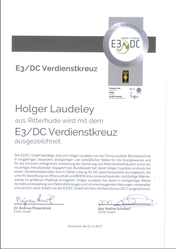 Die E3/DC GmbH bestätigt, dass sich Holger Laudeley in langjähriger, besonders einzigartiger und vorbildlicher Weise für die Energiewende und für die normativ erfolgreiche Umsetzung der Sanierung von Mehrfamilienhäusern durch ein neuartiges Messkonzept engagiert hat. Bundesweit hat damit Holger Laudeley erstmals einem Verteilnetzbetreiber eine 4-Zähler-Lösung für DC-Speichersysteme durchgesetzt, die unter Einbeziehung von Photovoltaik und BHKW eine vorausschauende, nachhaltige Wärmewende im größeren Maßstab ermöglicht.“