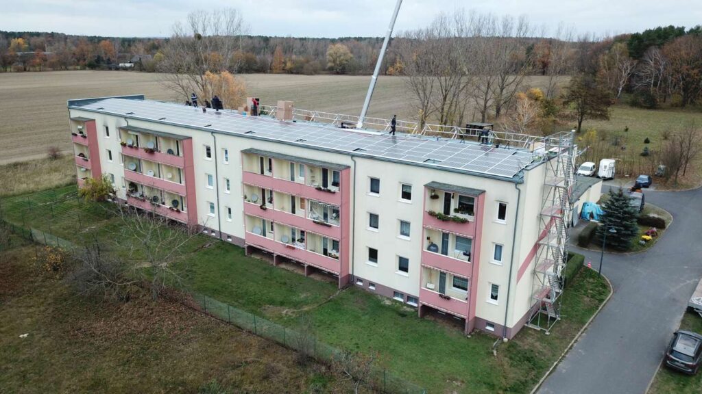Als das Team Anfang Dezember das nächste Mal nach Ludwigsfelde kommt, läuft wieder einiges schief: Der Teleskoplader, der gebraucht wird, um die Solarmodule auf das Mehrfamilienhaus zu bekommen – immerhin 288 Stück – kommt verspätet. Doch damit nicht genug: Auch die Speichersysteme von E3/DC kommen nicht pünktlich. Ergo: Nach der nächsten Nacht-schicht sind die Speicher und die Solarmodule installiert.
