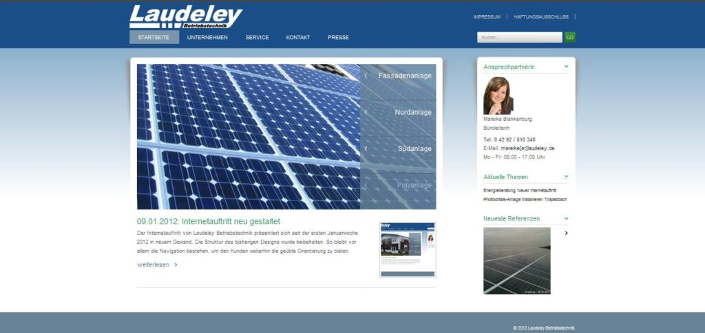 Der Internetauftritt von Laudeley Betriebstechnik präsentiert sich seit der ersten Januarwoche 2012 in neuem Gewand. Die Struktur des bisherigen Designs wurde beibehalten. So bleibt vor allem die Navigation bestehen, um den Kunden weiterhin die geübte Orientierung zu bieten.