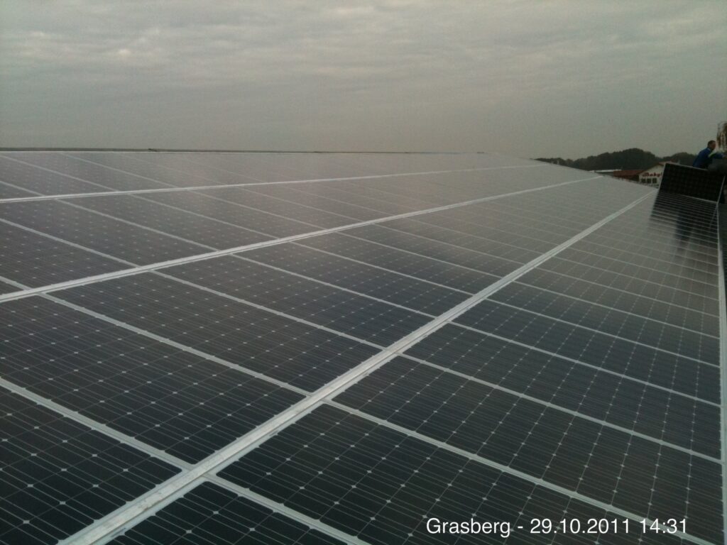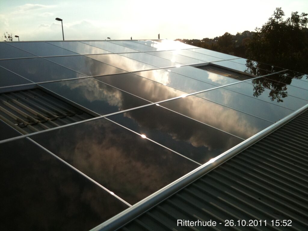 Photovoltaik-Anlagen (PV-Anlagen) sind generell pflegeleicht. Flache und flach geneigte Anlagen unter zwölf Grad sollten allerdings etwa alle zwei Jahre professionell gereinigt werden. Dafür nutzt das Team um Diplom-Ingenieur Holger Laudeley den betriebseigenen Kran (41m Hakenhöhe, 36m Seitenauslage). So können auch schwer erreichbare und besonders große Anlagen schnell und gründlich gereinigt werden.