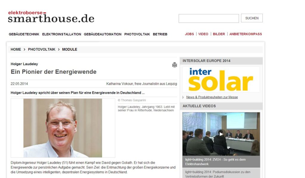 „Diplom-Ingenieur Holger Laudeley (51) führt einen Kampf wie David gegen Goliath. Er hat sich die Energiewende zur persönlichen Aufgabe gemacht. Sein Ziel: die Entmachtung der großen Energiekonzerne und die Umsetzung eines intelligenten, dezentralen Energiesystems in Deutschland“ – so treffend charakterisiert das Magazin Elektrobörse Smarthouse Holger Laudeley, der gerade zusammen mit Axel Joost das neue Unternehmen […]